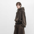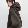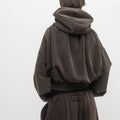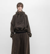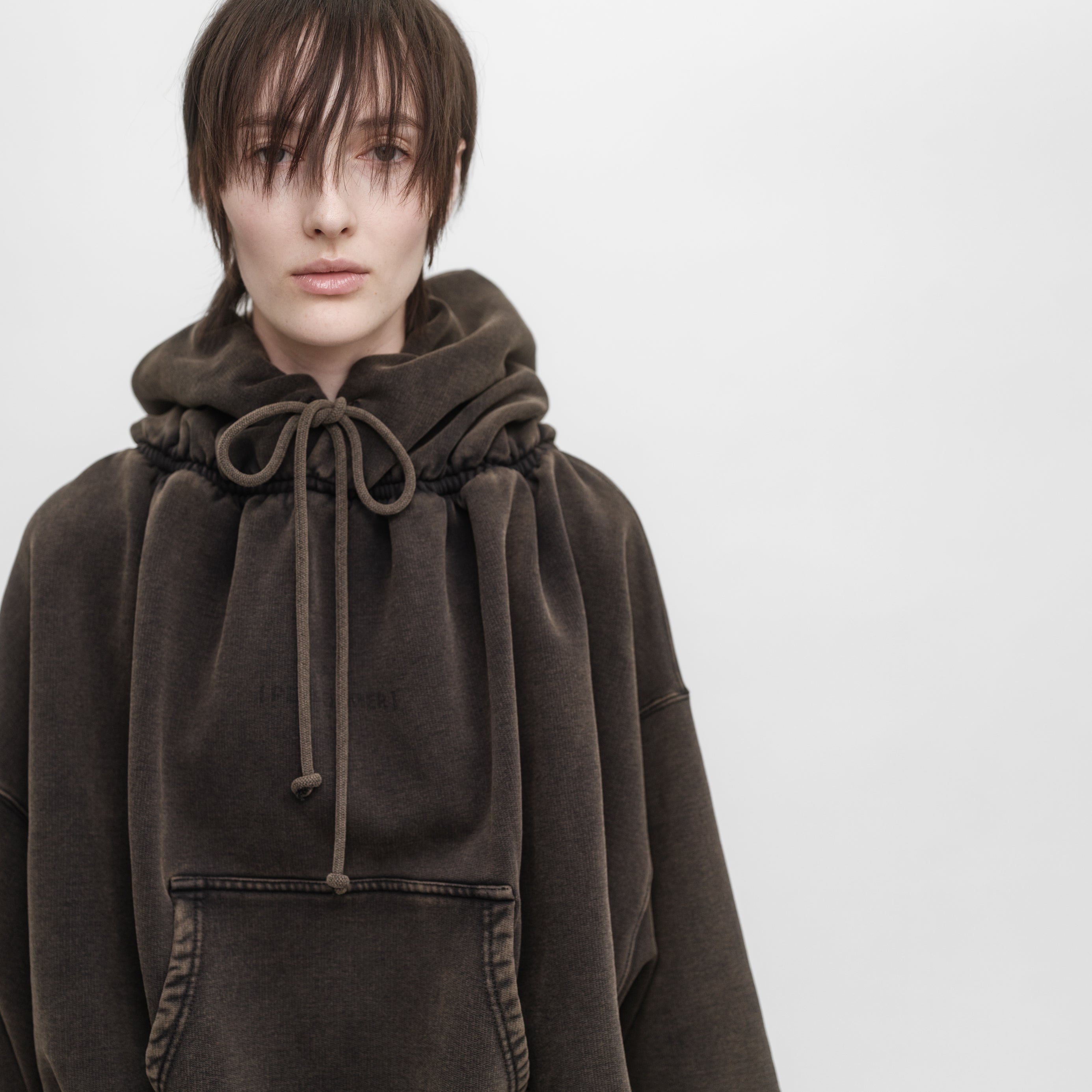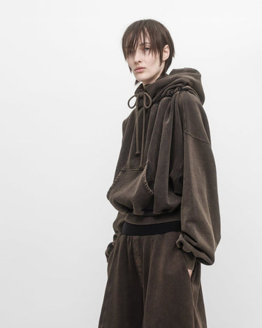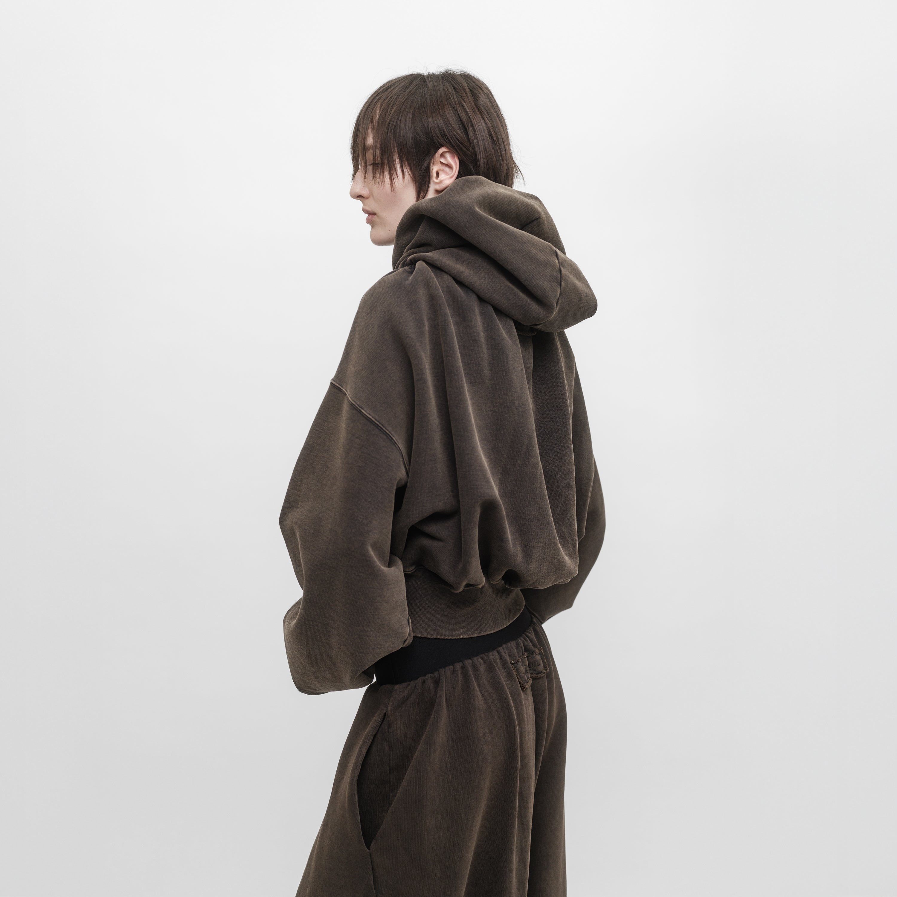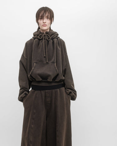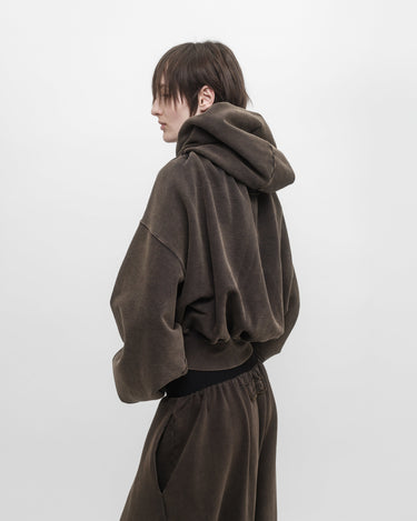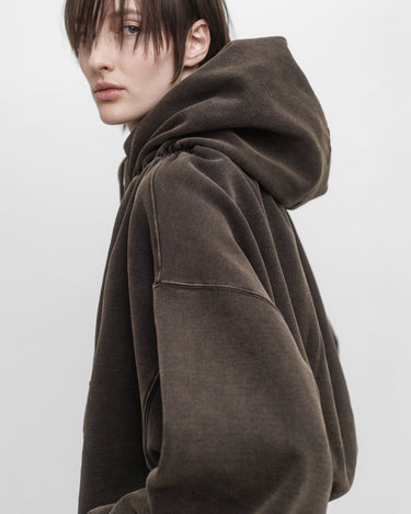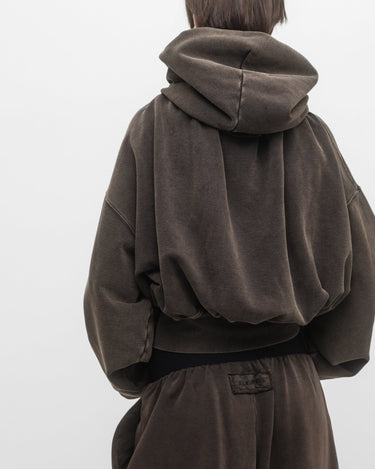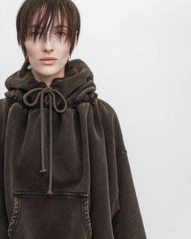 Cropped hoodie with gathered neckline volume and front pocket. Crafted in brushed fleece in fade-out brown, with a seasonal black print at the front.