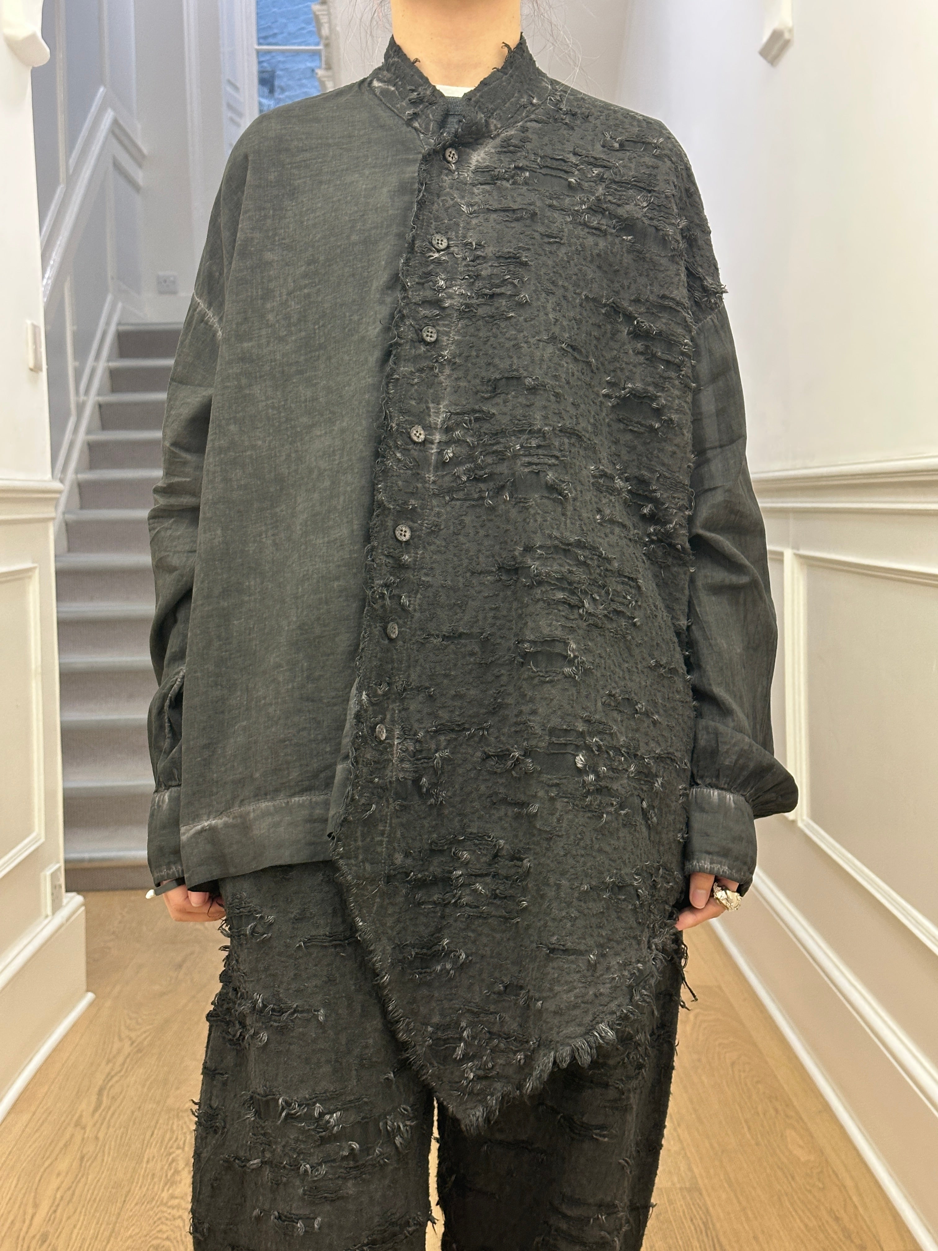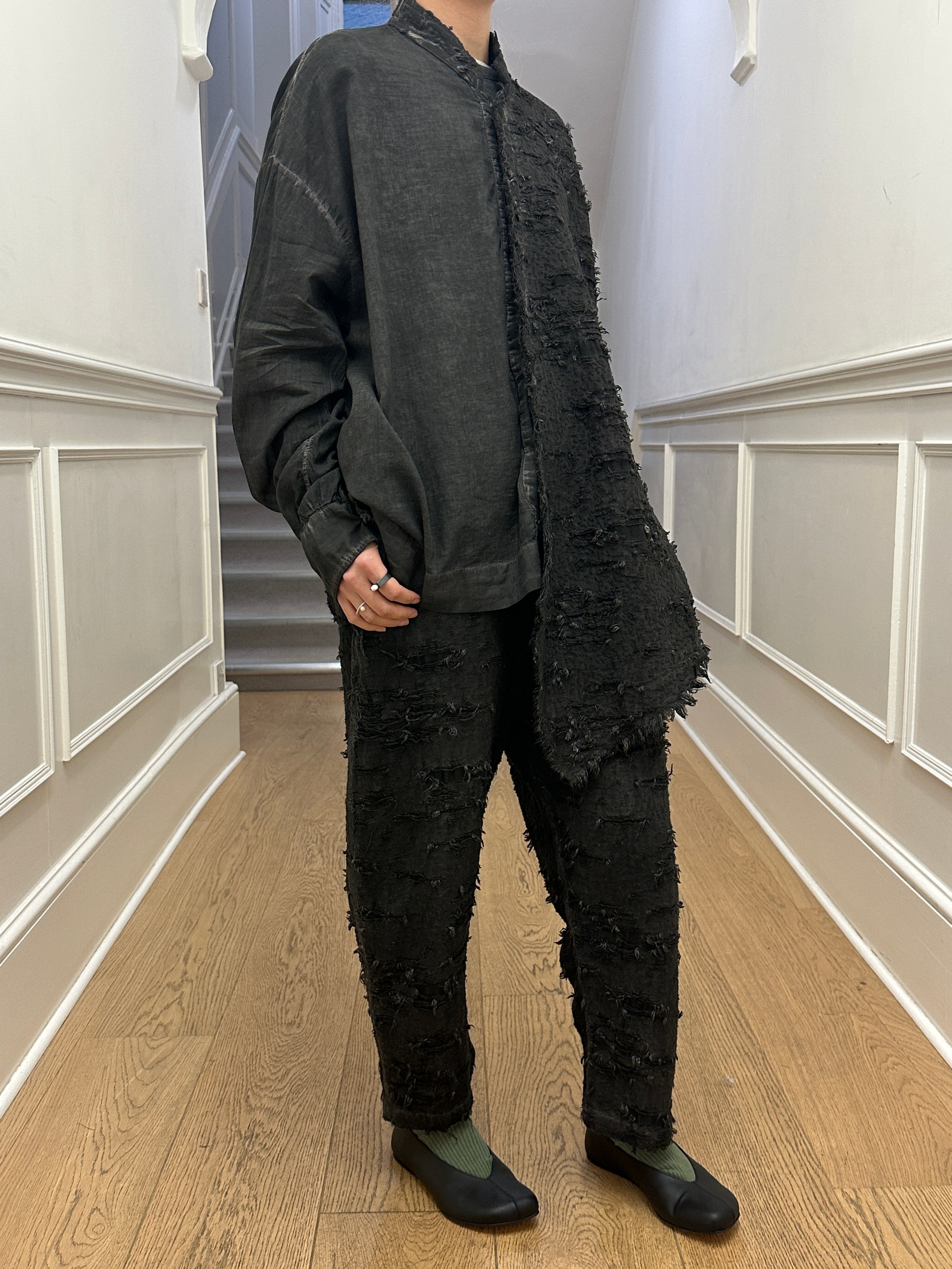 Beautiful shirt with great textures on one of the front panels from La Vaca Loca. It is in oversized fit and looks great with Ojo pants in the same fabric.