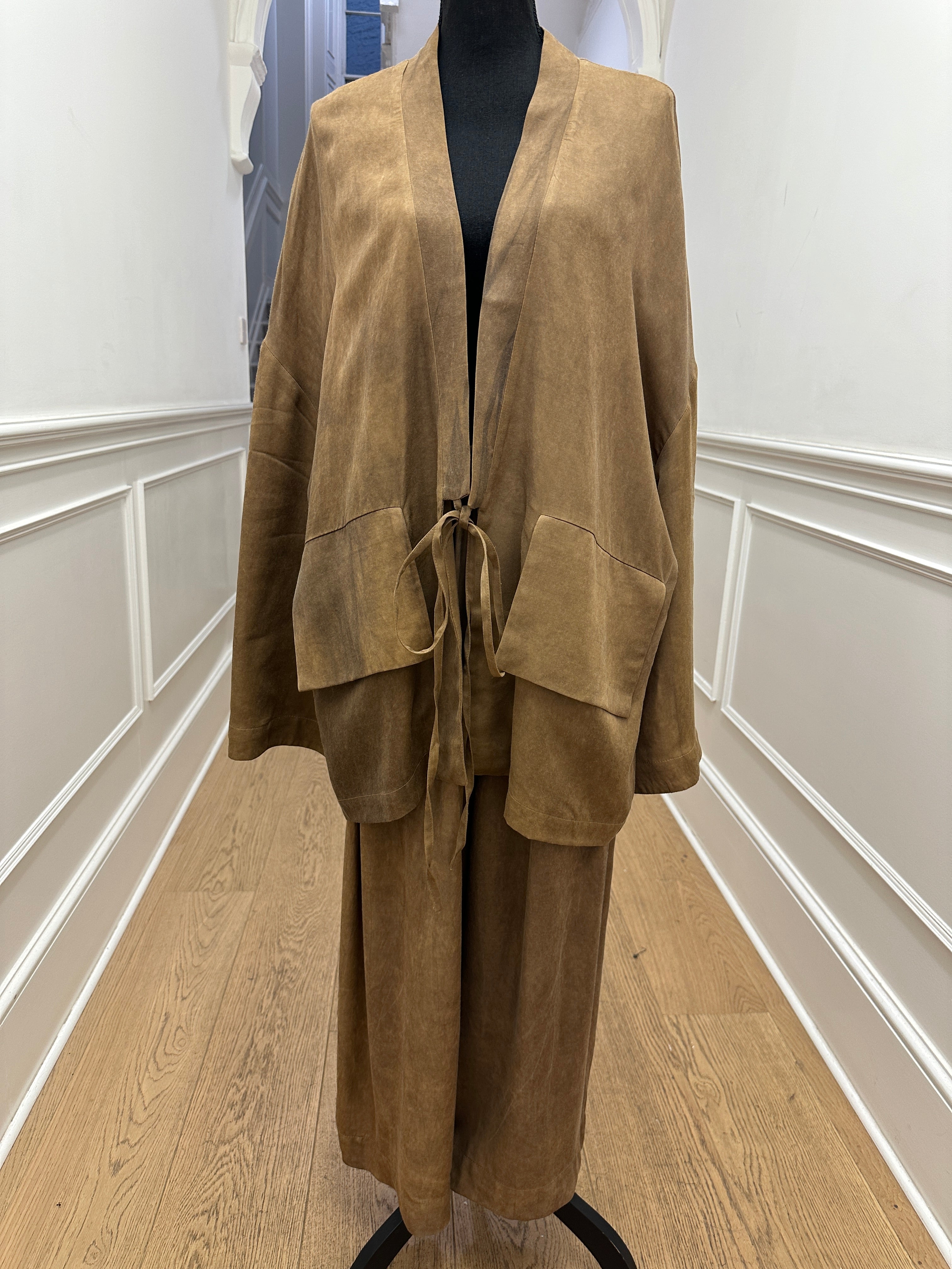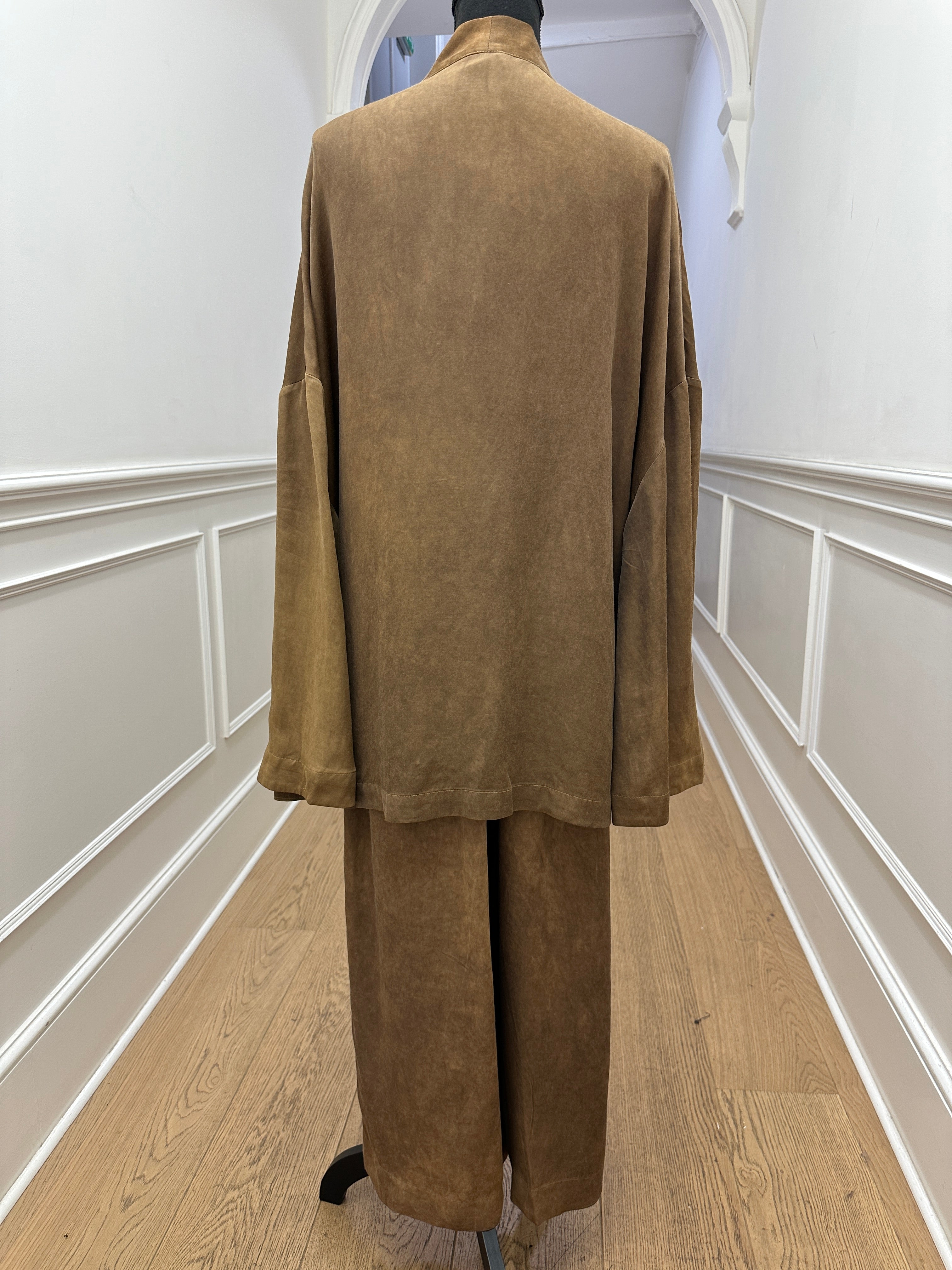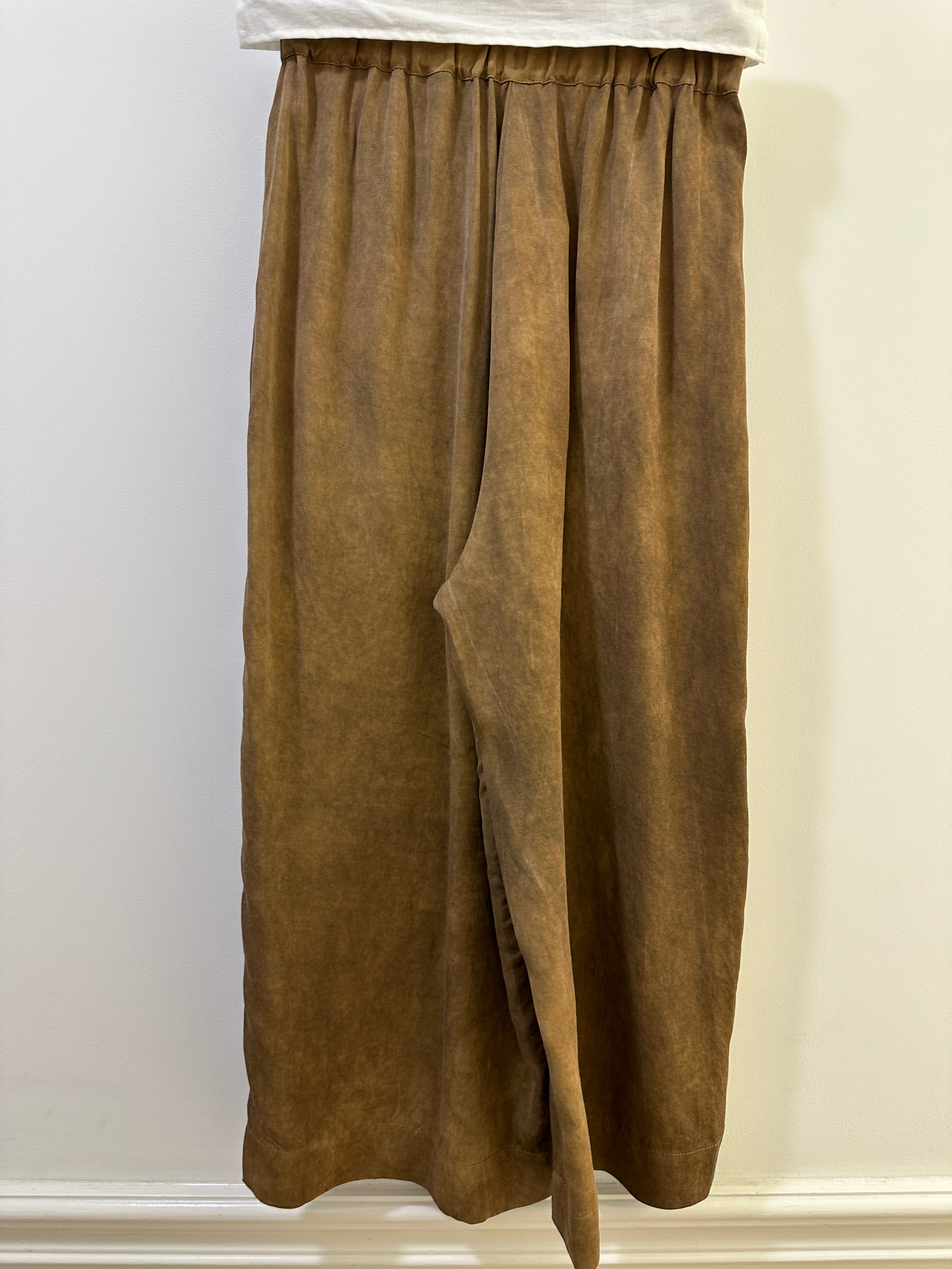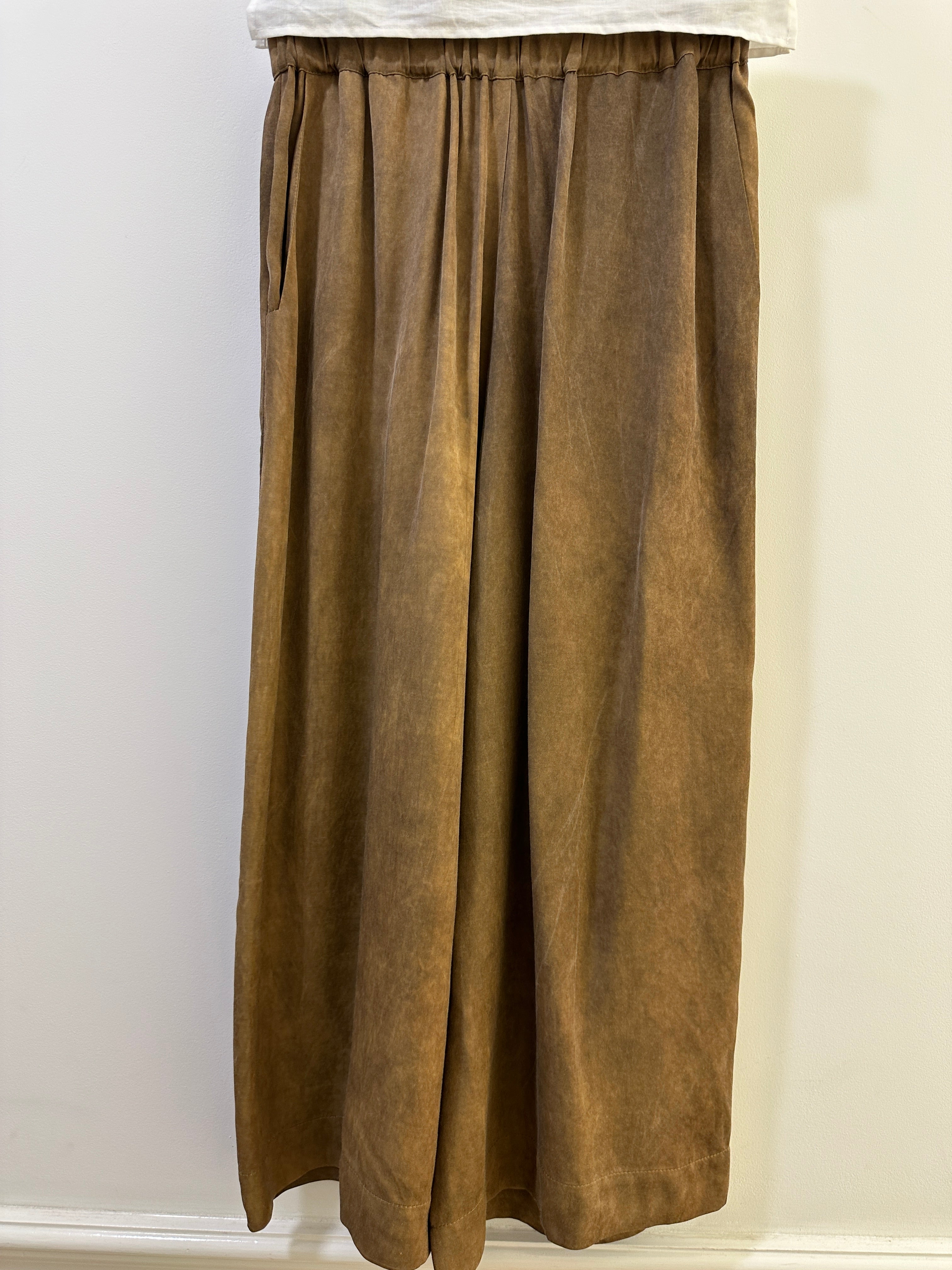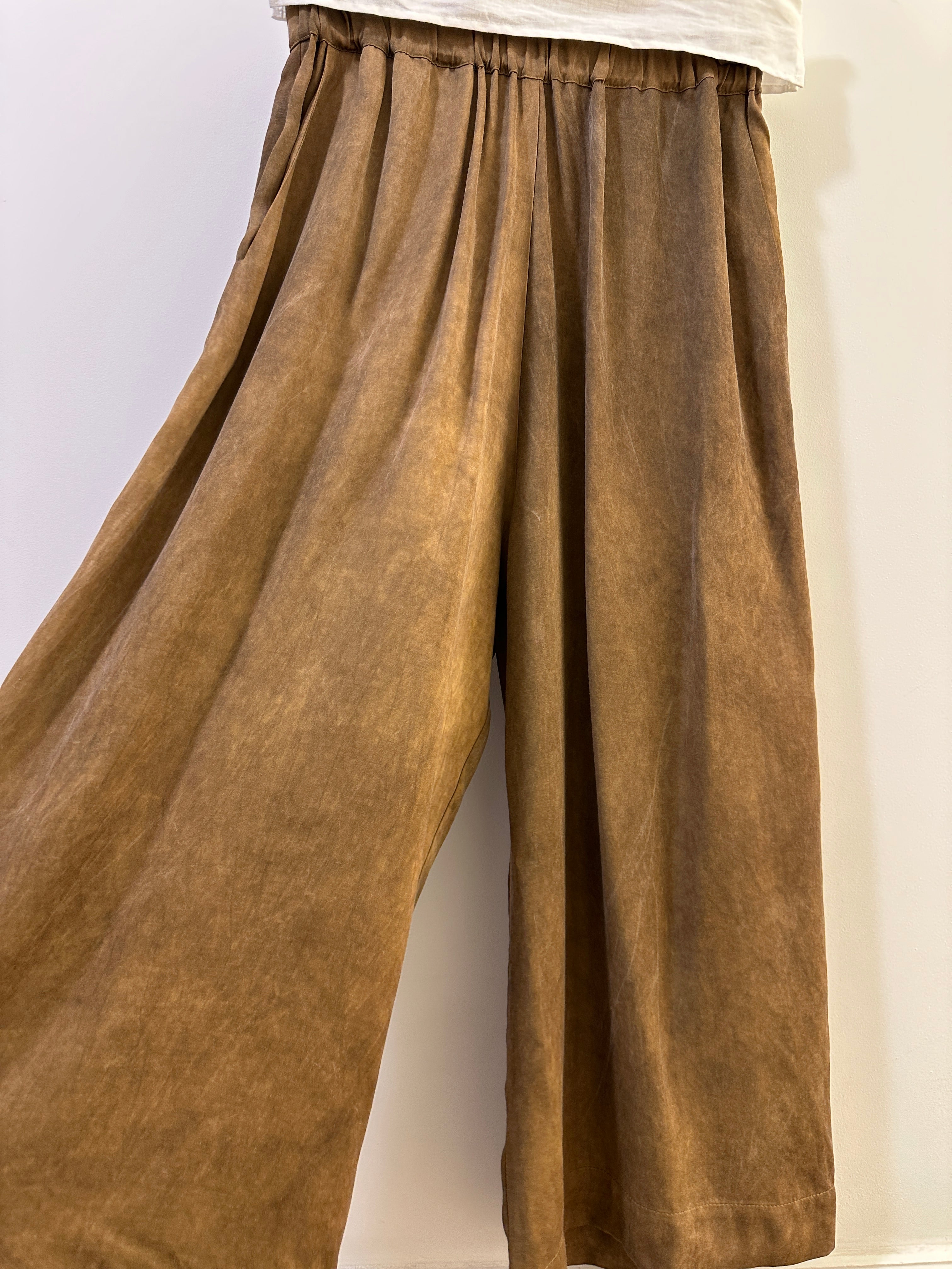 Very relax and easy to wear pants with two side pockets and elastic waistband from La Vaca Loca. It is in a such beautiful rich golden brown colour. This style looks great on both men and women.