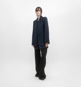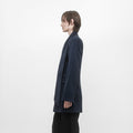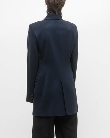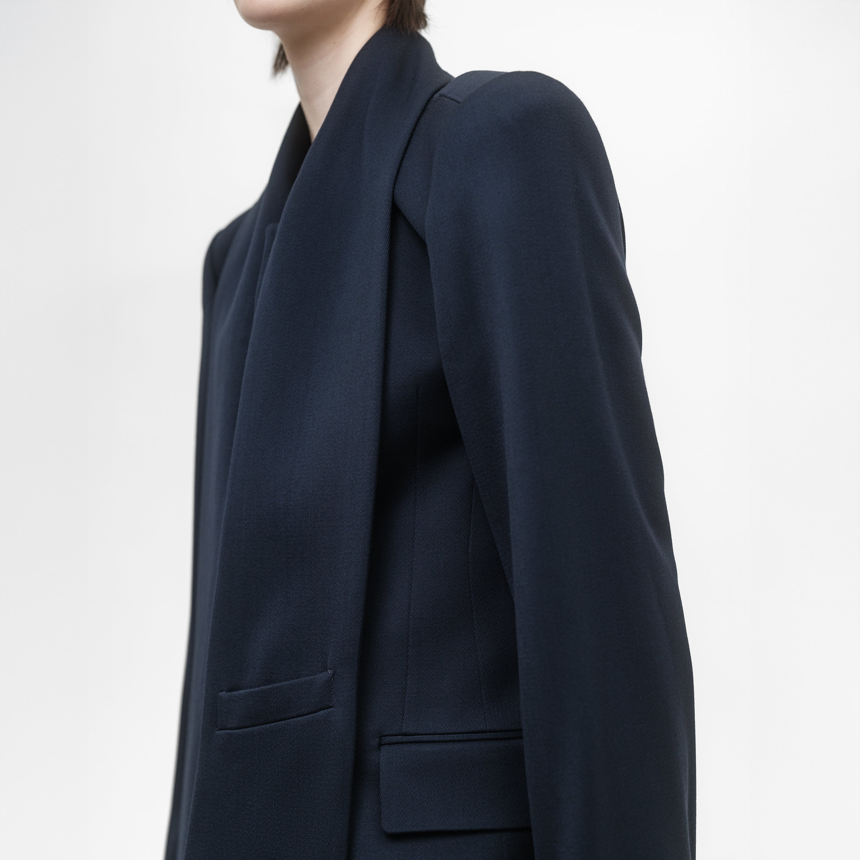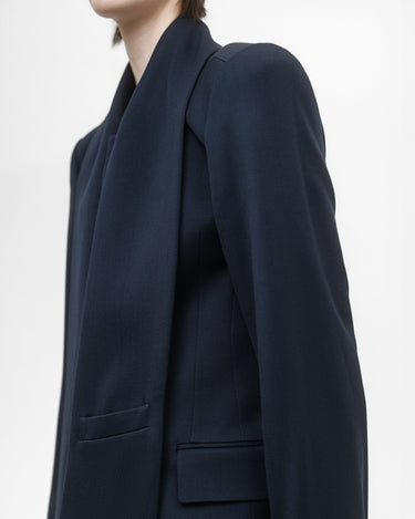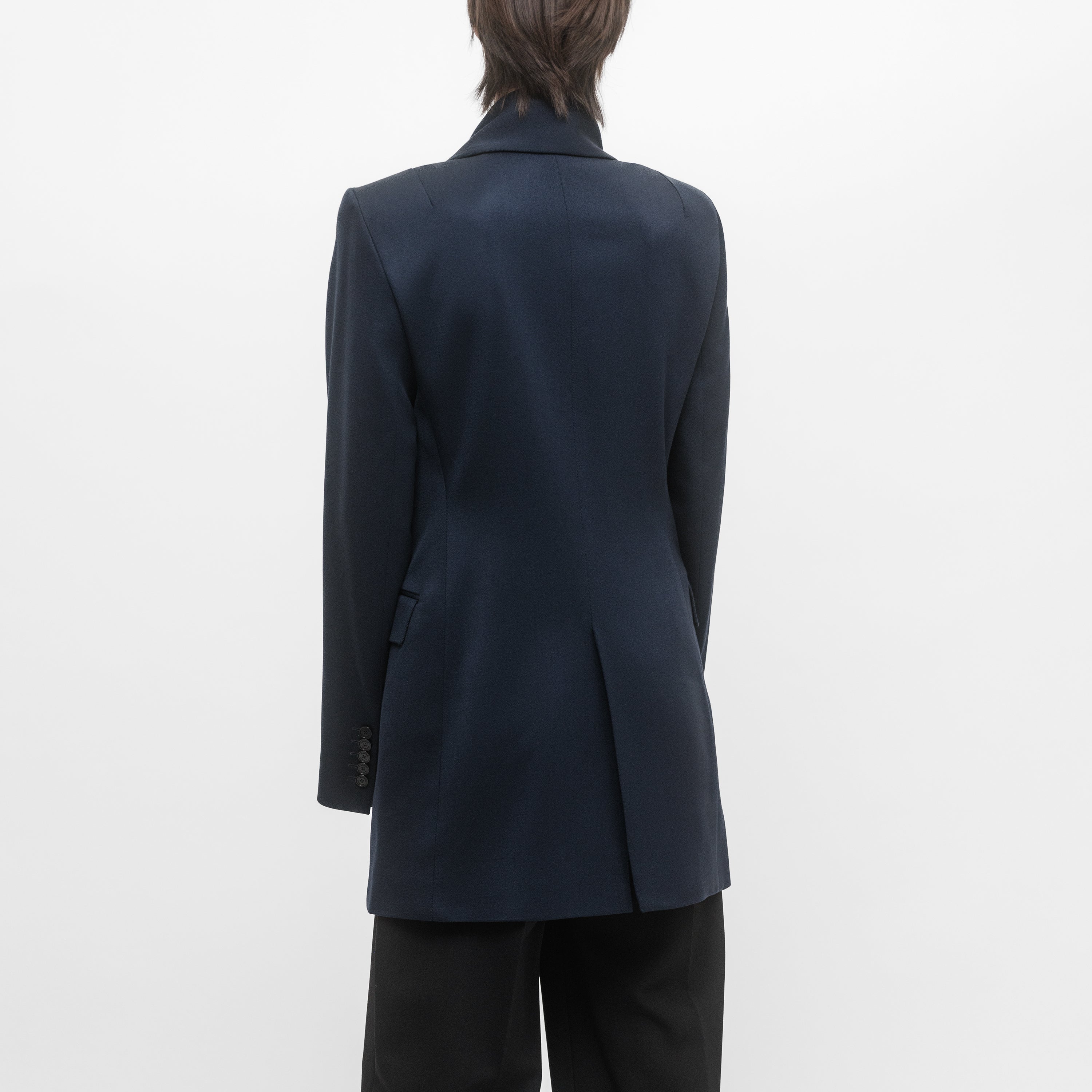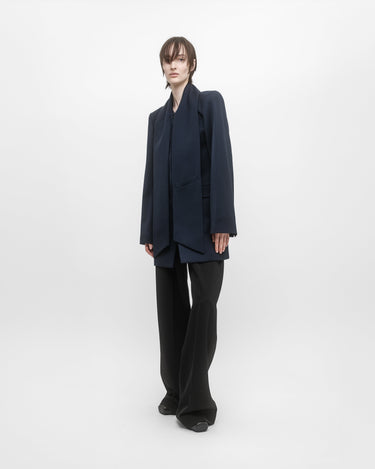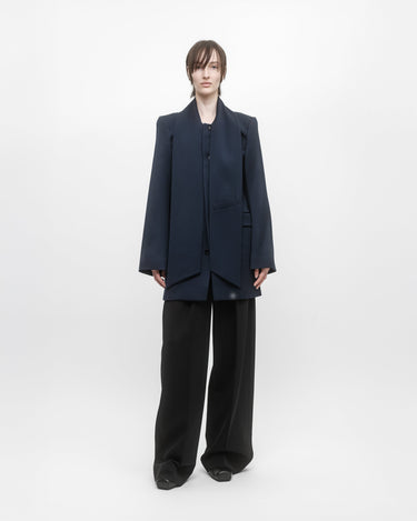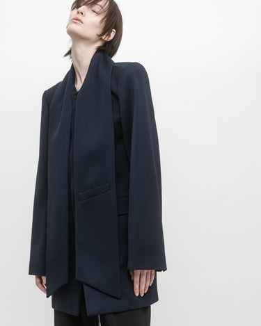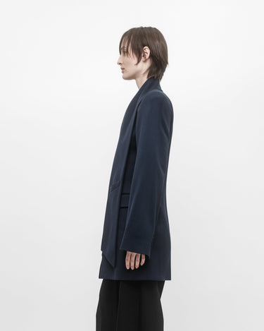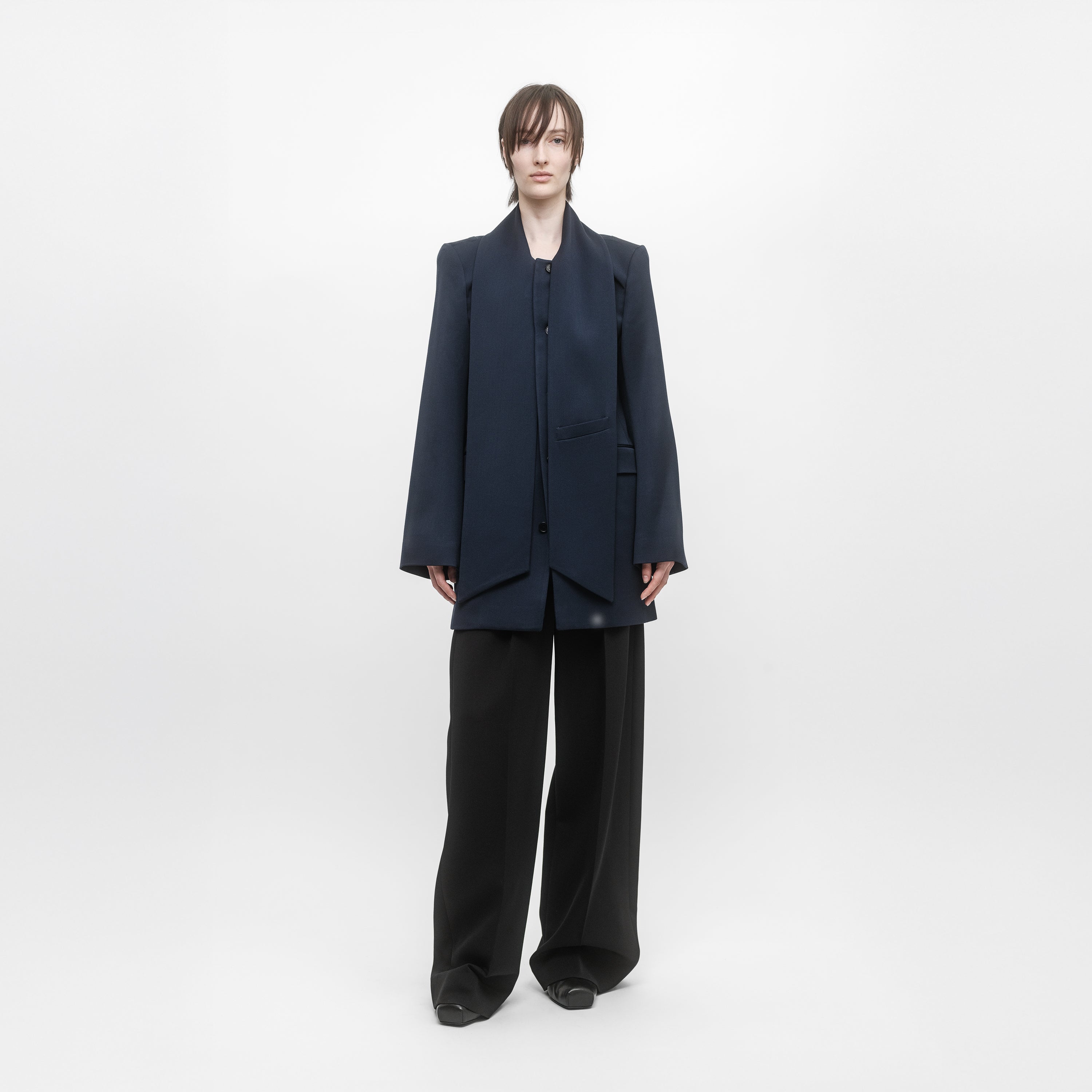 Single-breasted tailored jacket with a lavalière collar and a structured silhouette. Crafted from fine virgin wool, it features a studied collarbone fold with forward-tilted shoulder pads to bring attitude to the wearer. Finished with natural corozo buttons.