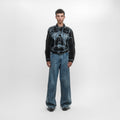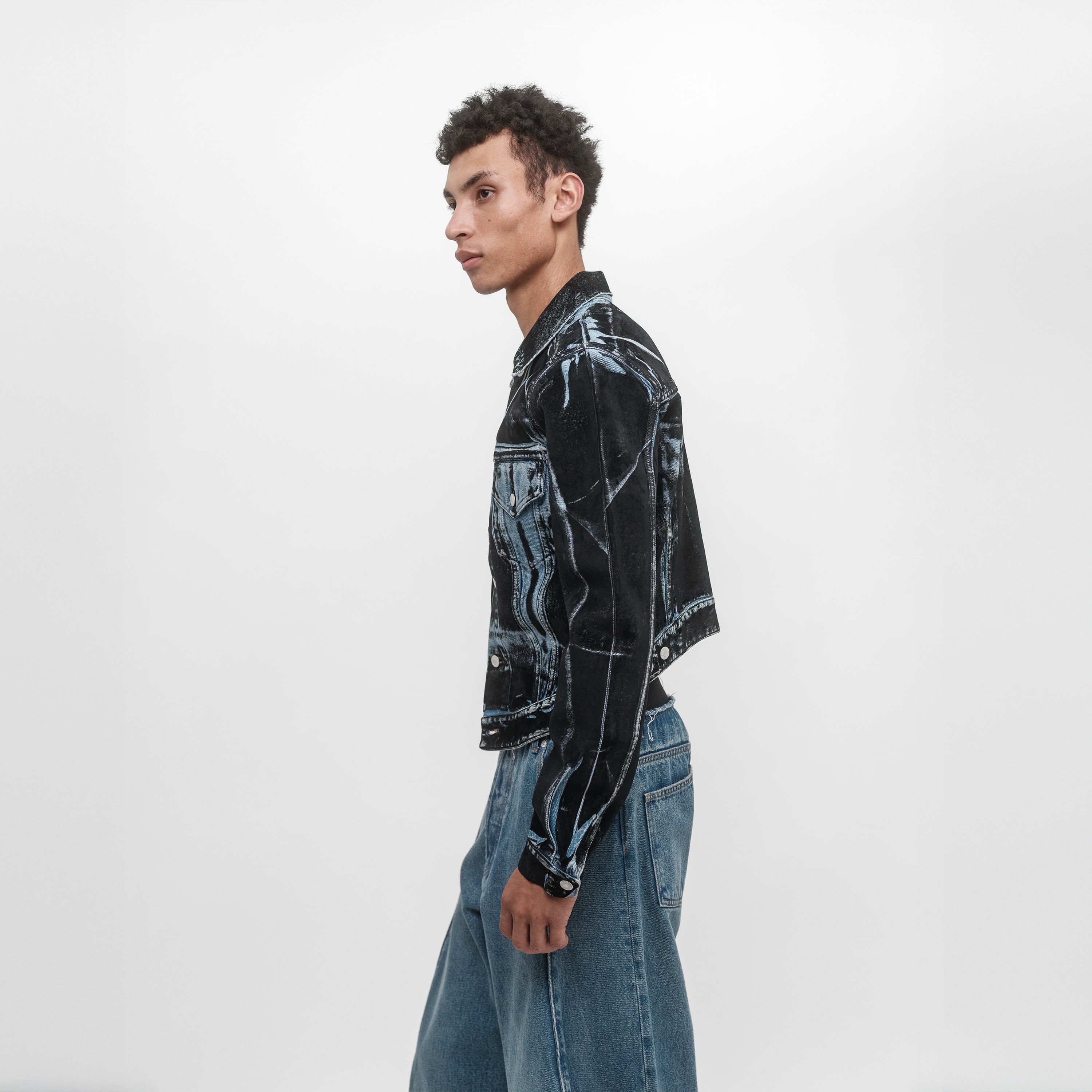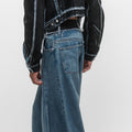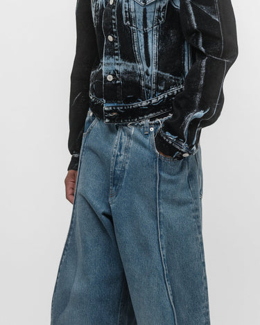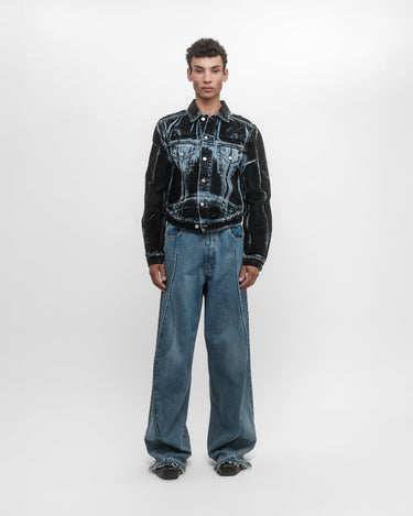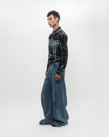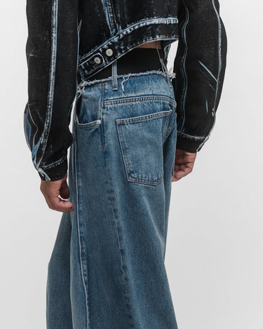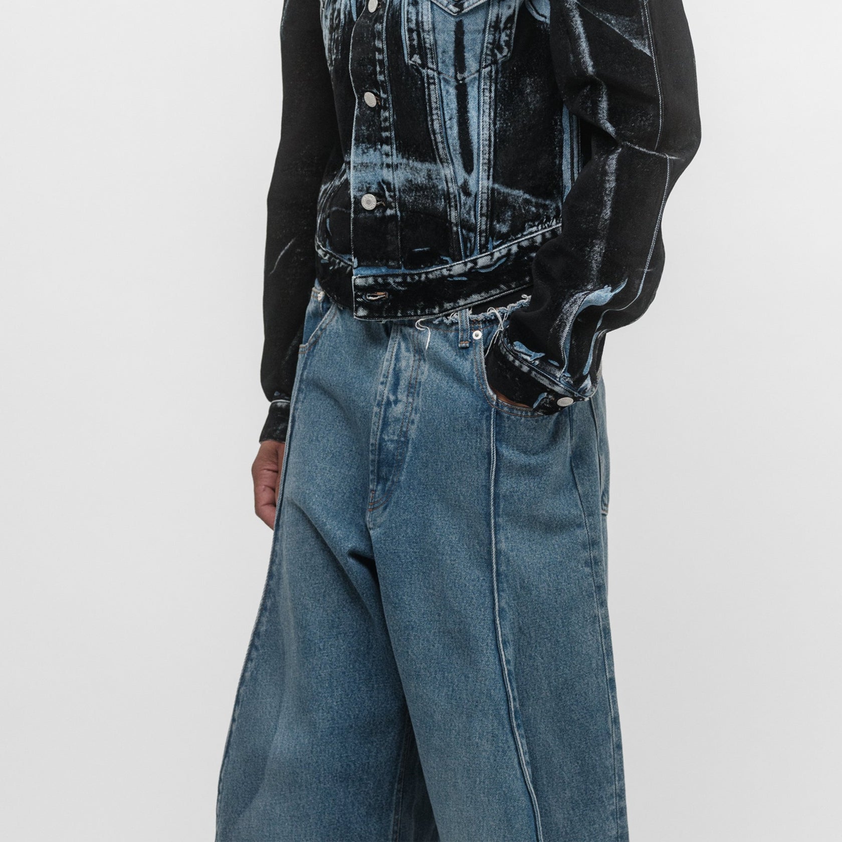 Relaxed fit jean with five-pocket construction. Studied knee shape and elasticated waistband. Bleu vintage wash in cotton denim with soft touch, splashed paint and contrasted topstitching.