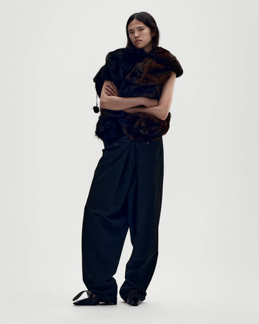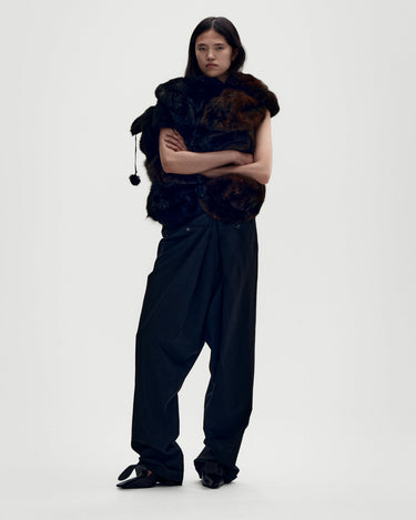 The Double Back Wide Trousers are defined by their relaxed fit and backwards appearance. Zipper and hook and eye closing. Back pockets with botton closing, front and back. Relaxed fit.