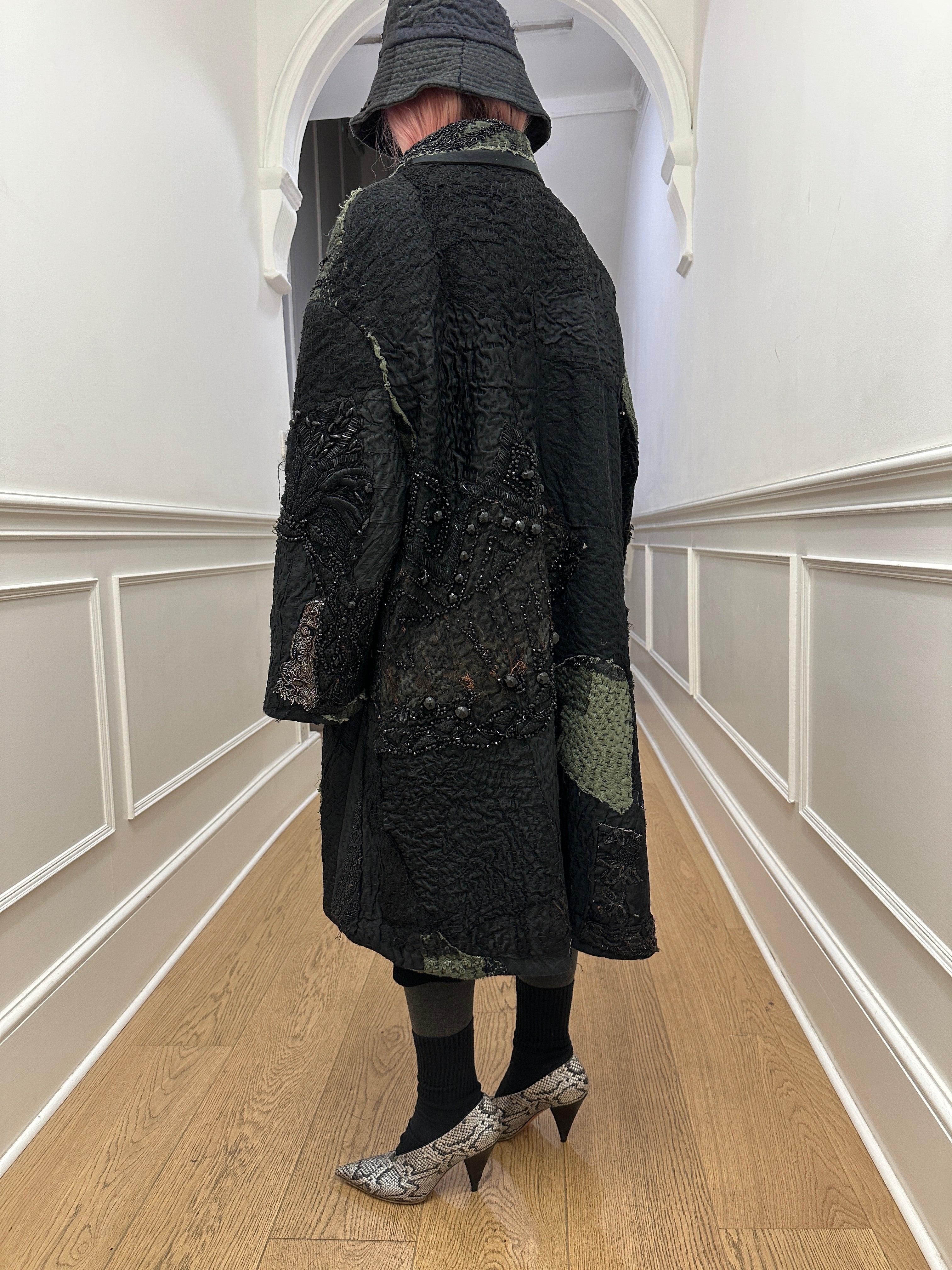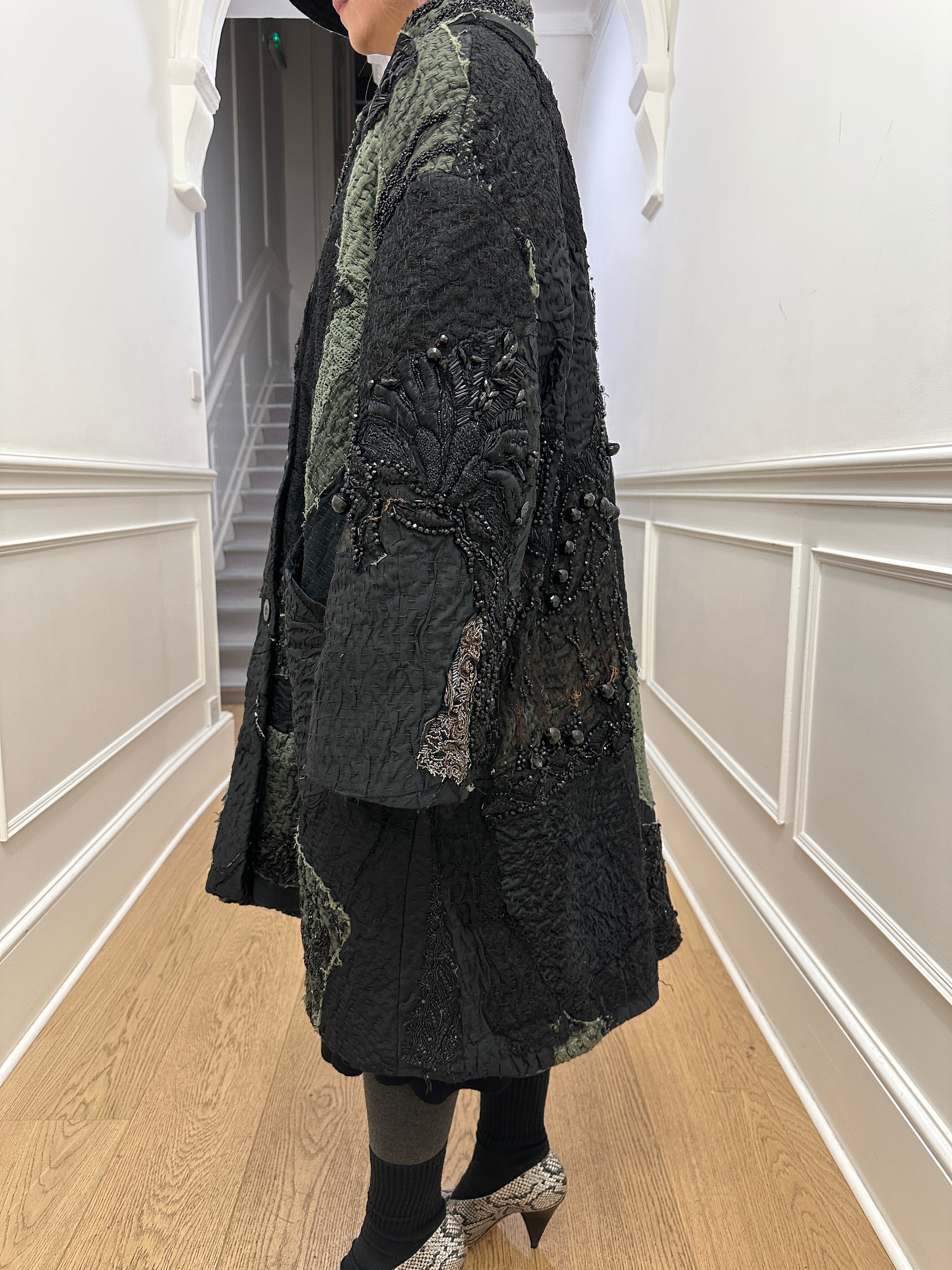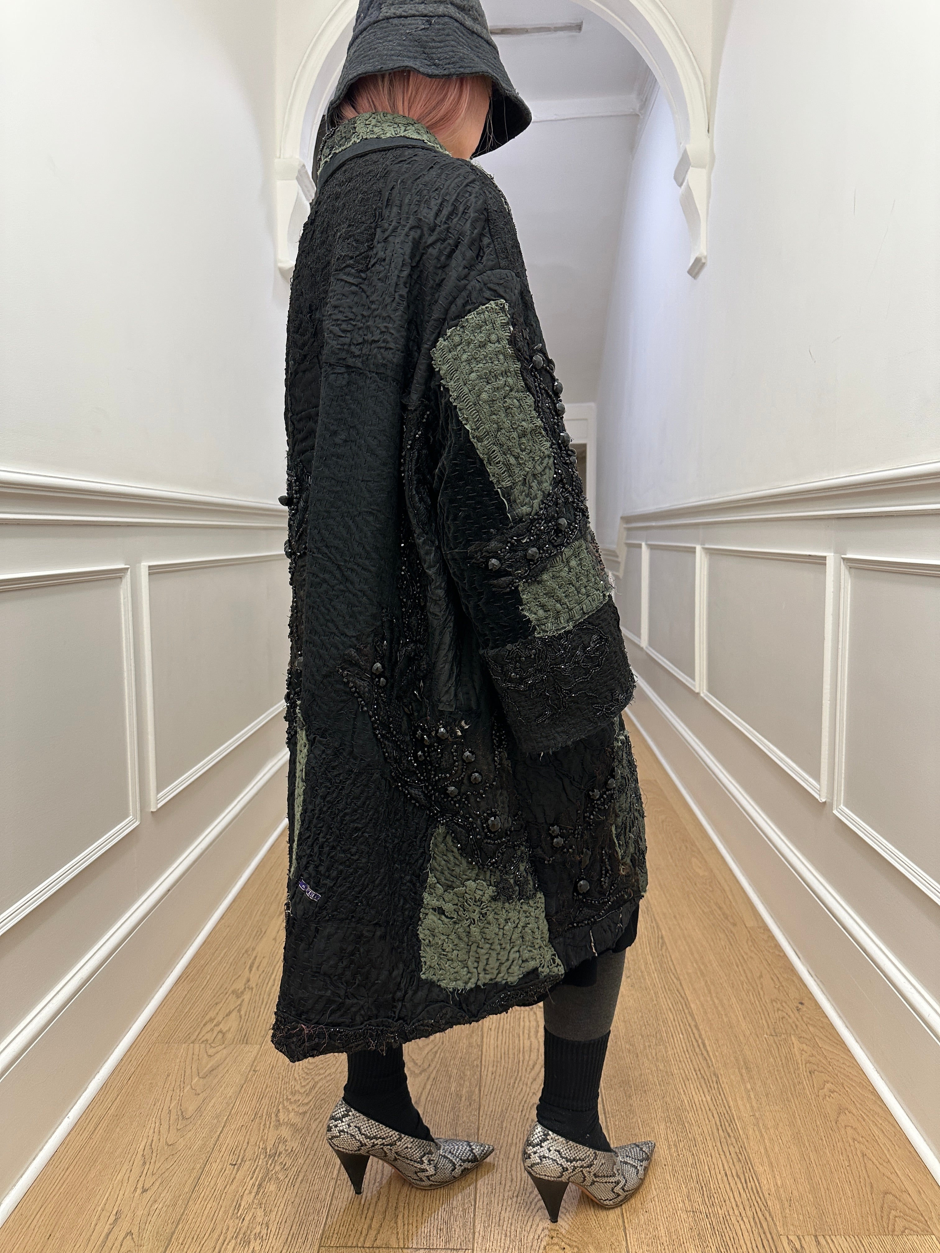 One of a kind By Walid Georgina Coat made in patchwork of 19th century Victorian jet beading on silk velvet. It’s the oversized fit and thin padded. The model was wearing size XS. (Chest measurement: 145 cm)
