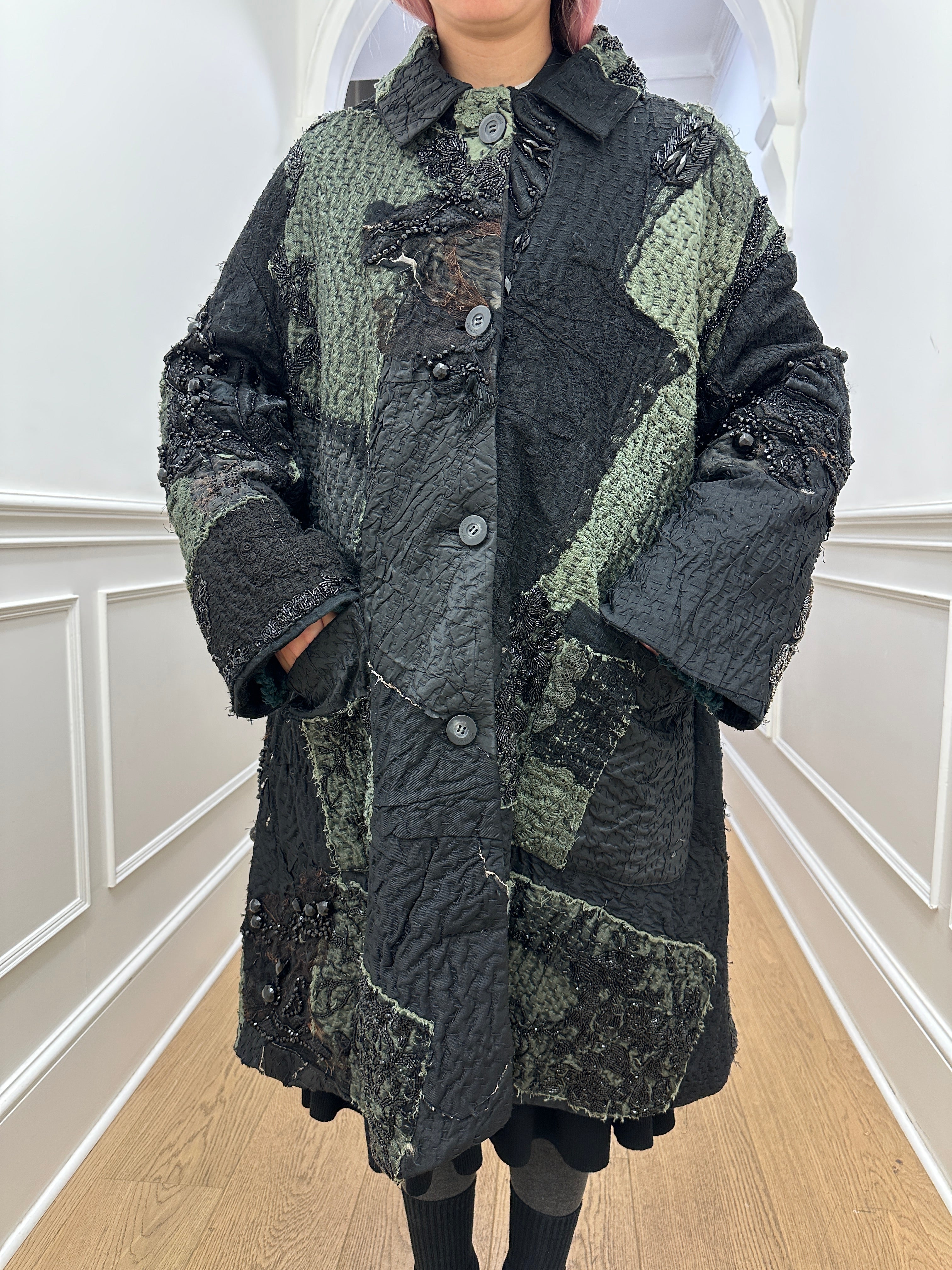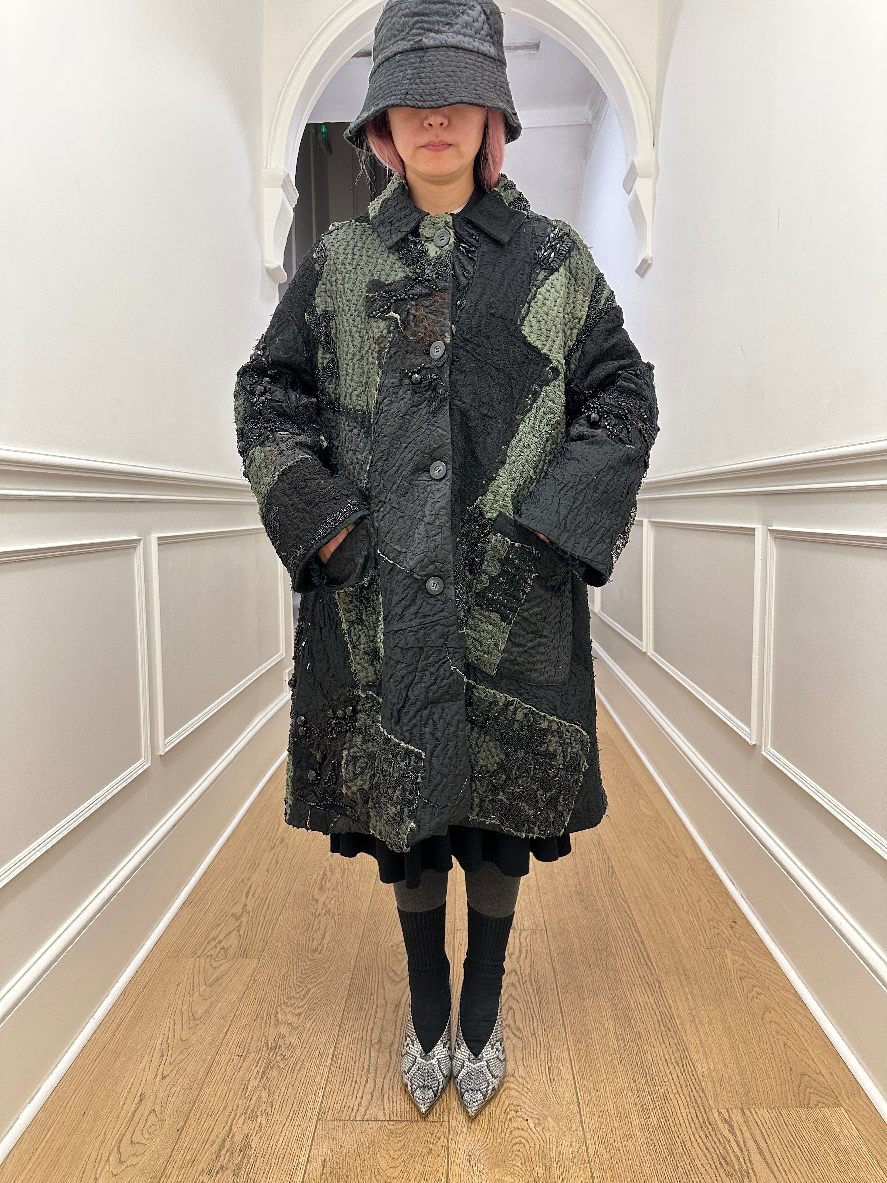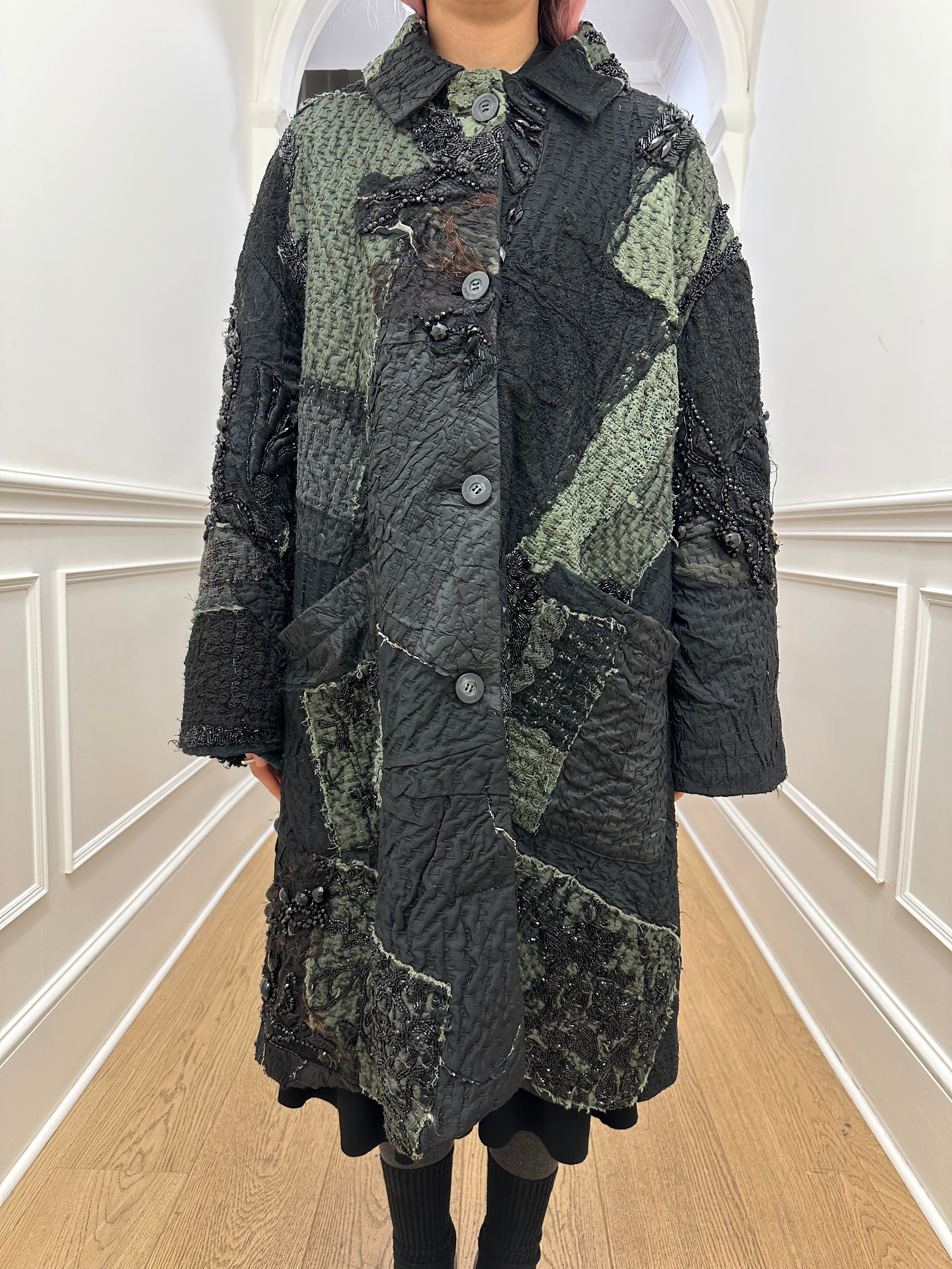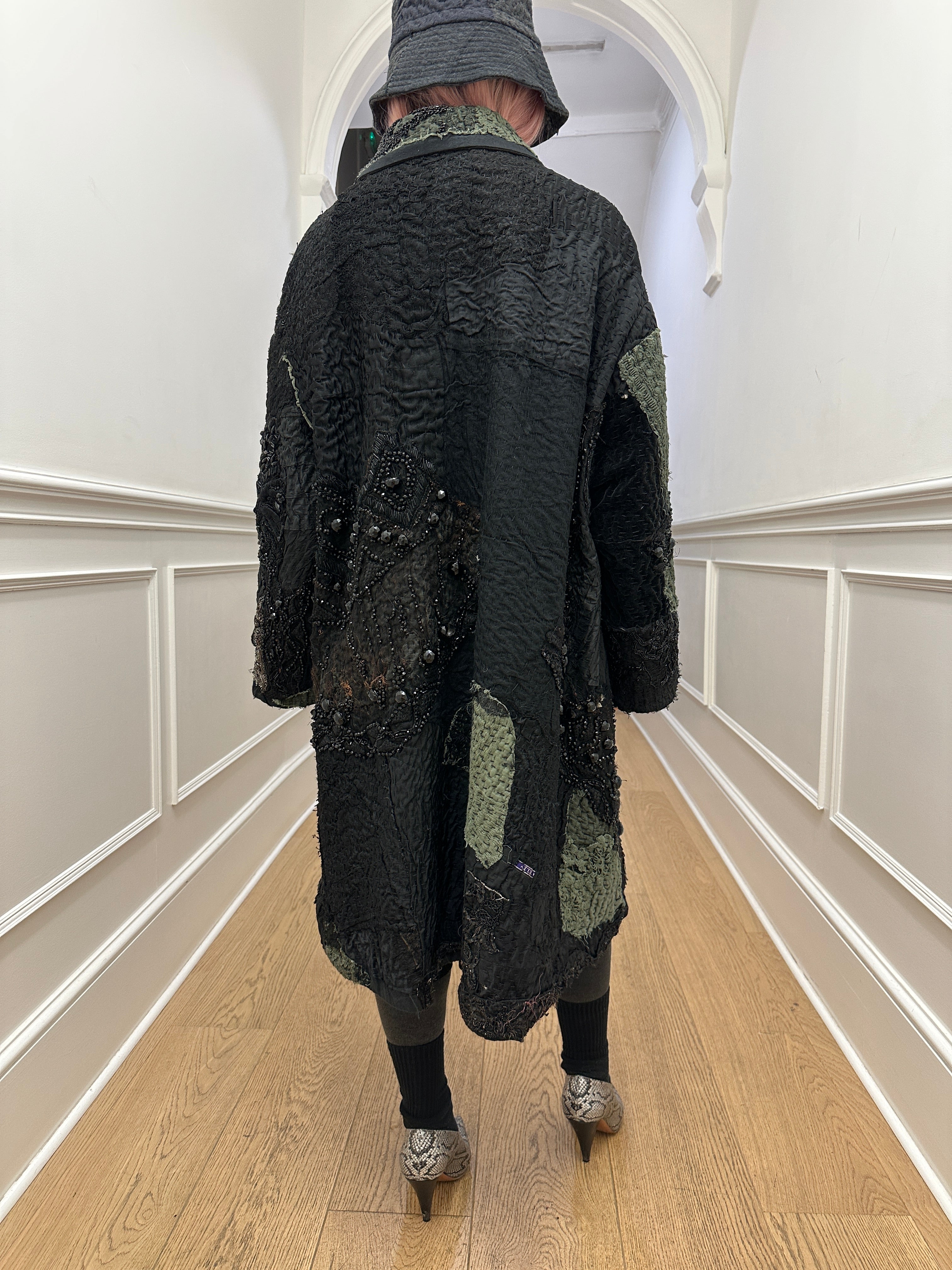 One of a kind By Walid Georgina Coat made in patchwork of 19th century Victorian jet beading on silk velvet. It’s the oversized fit and thin padded. The model was wearing size XS. (Chest measurement: 145 cm)