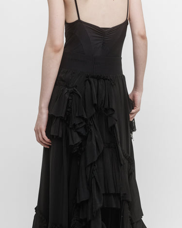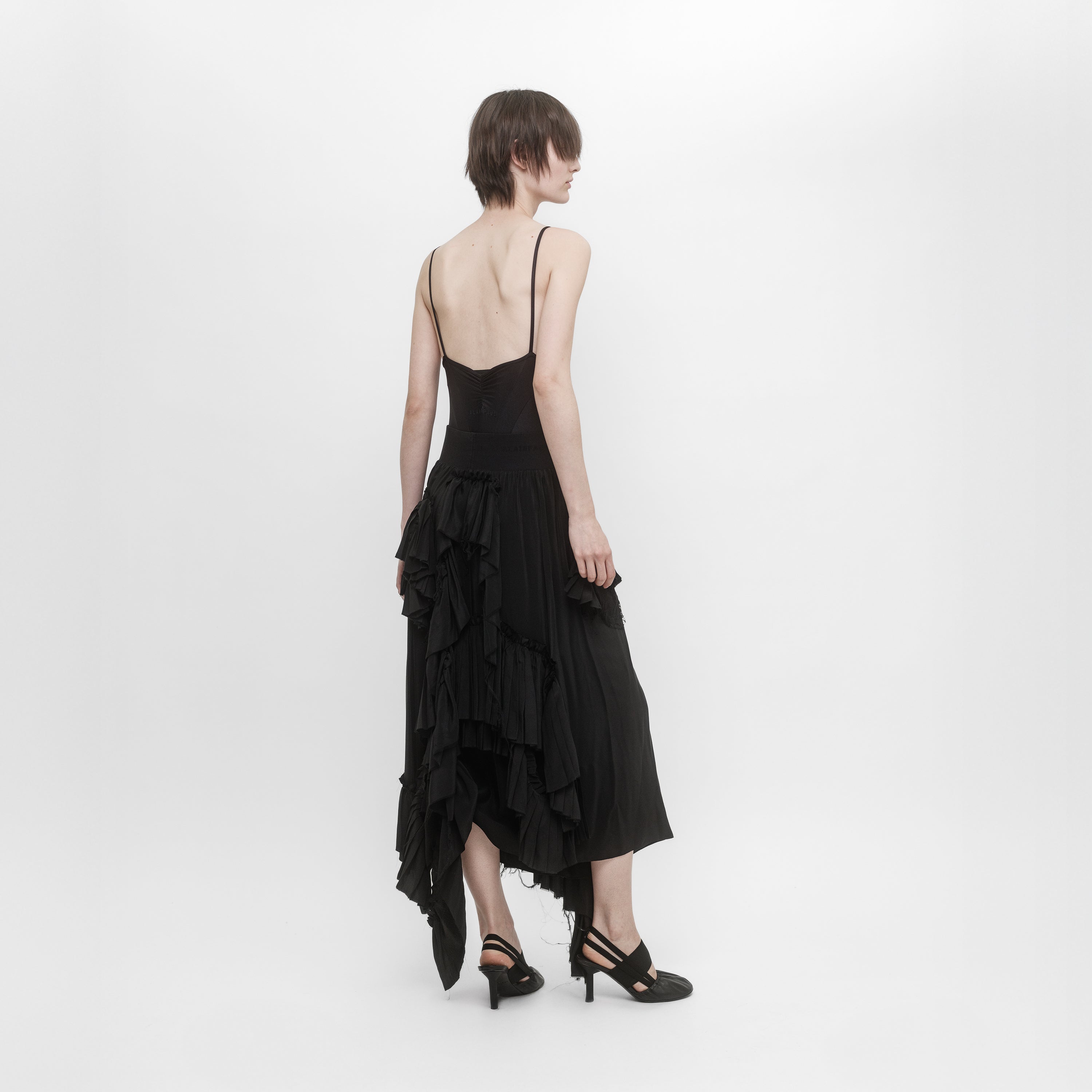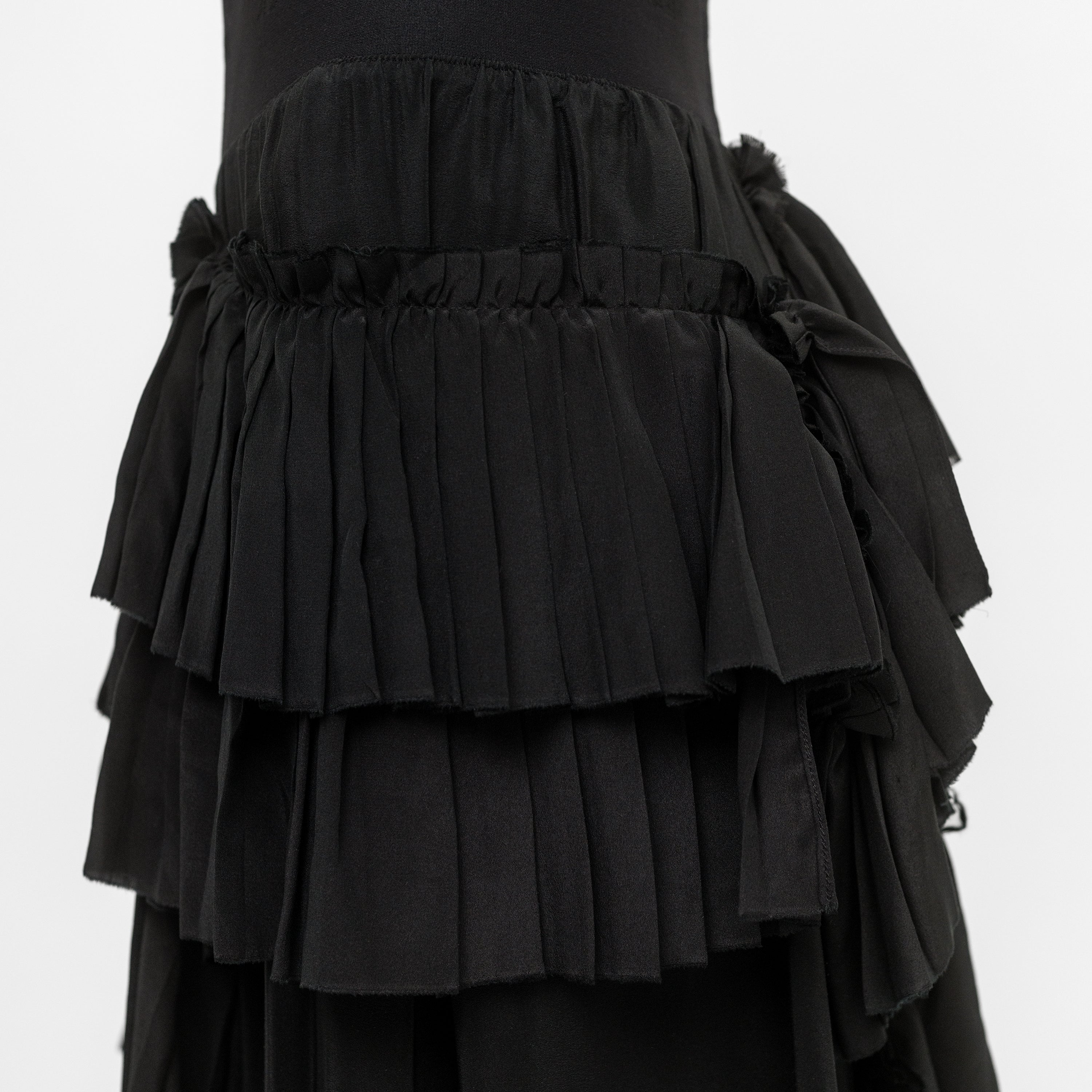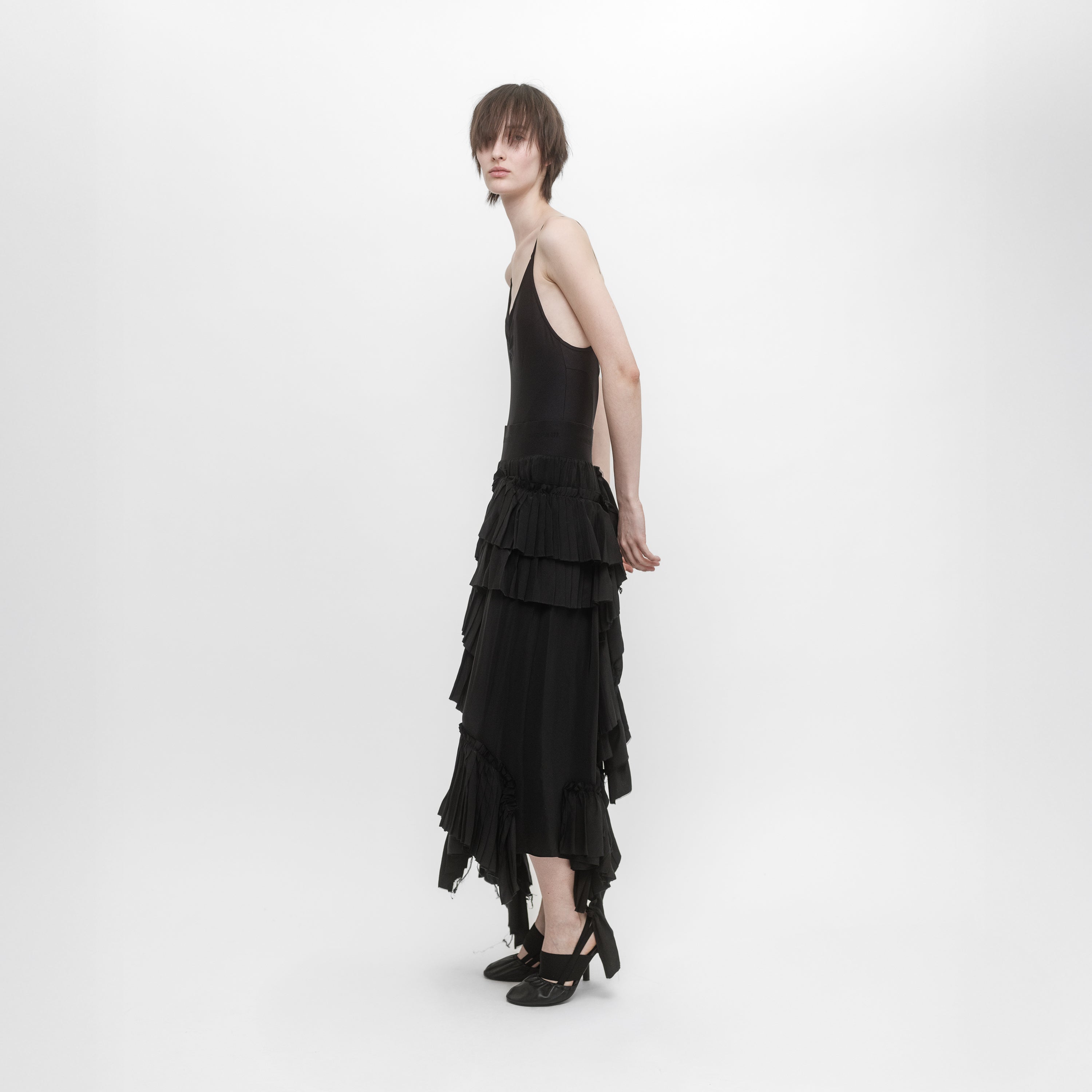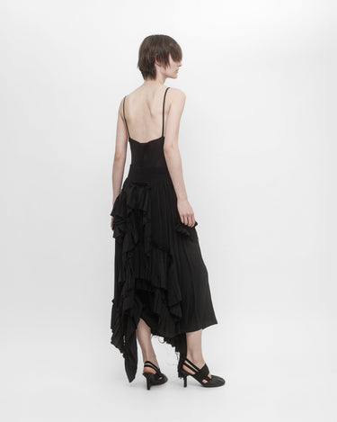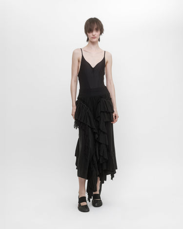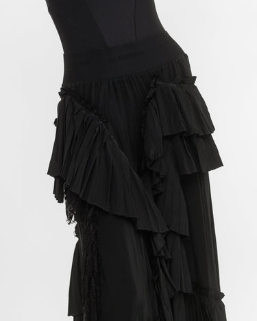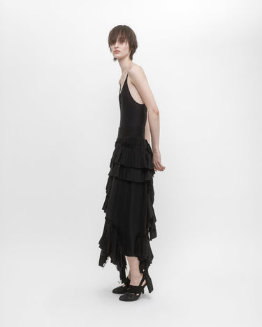 Elasticated waist skirt in silk crépe de Chine and lace ruffles. The irregular placement and the raw edge of the ruffles give an organic character to the skirt.